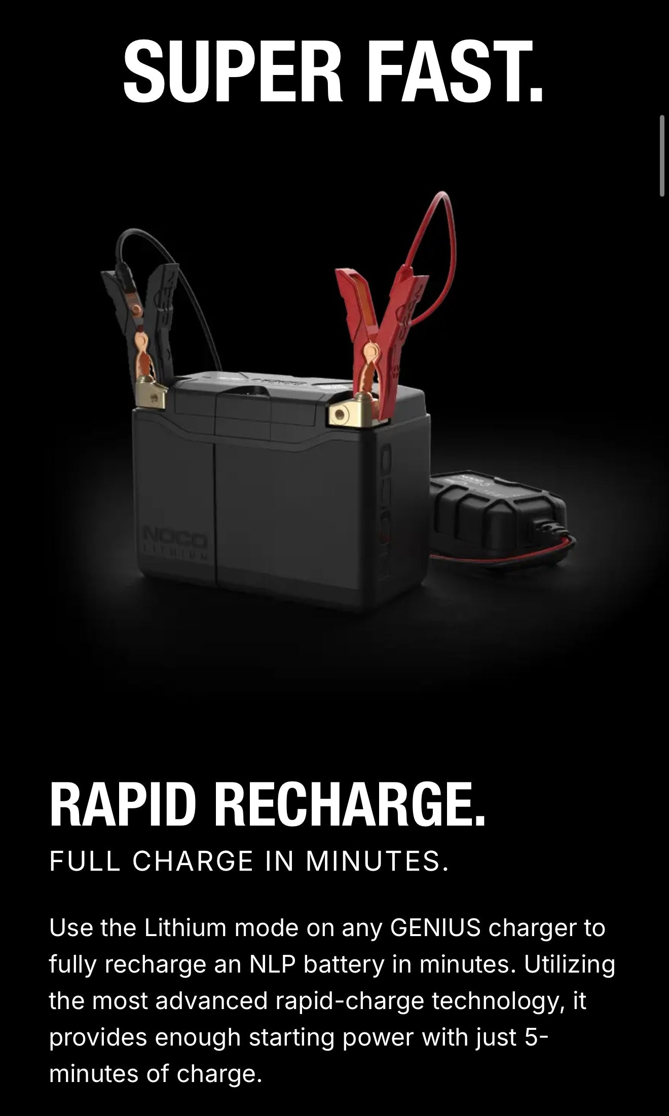 Use the Lithium mode on any GENIUS charger to fully recharge an NLP battery in minutes. Utilizing the most advanced rapid-charge technology, it provides enough starting power with just 5-minutes of charge.