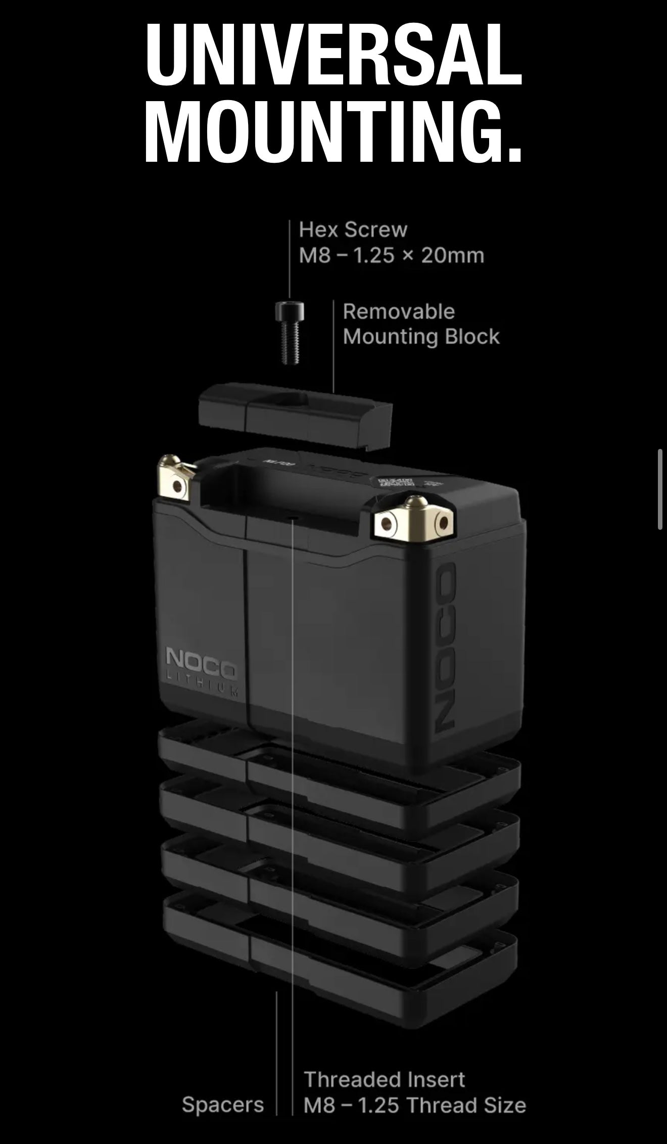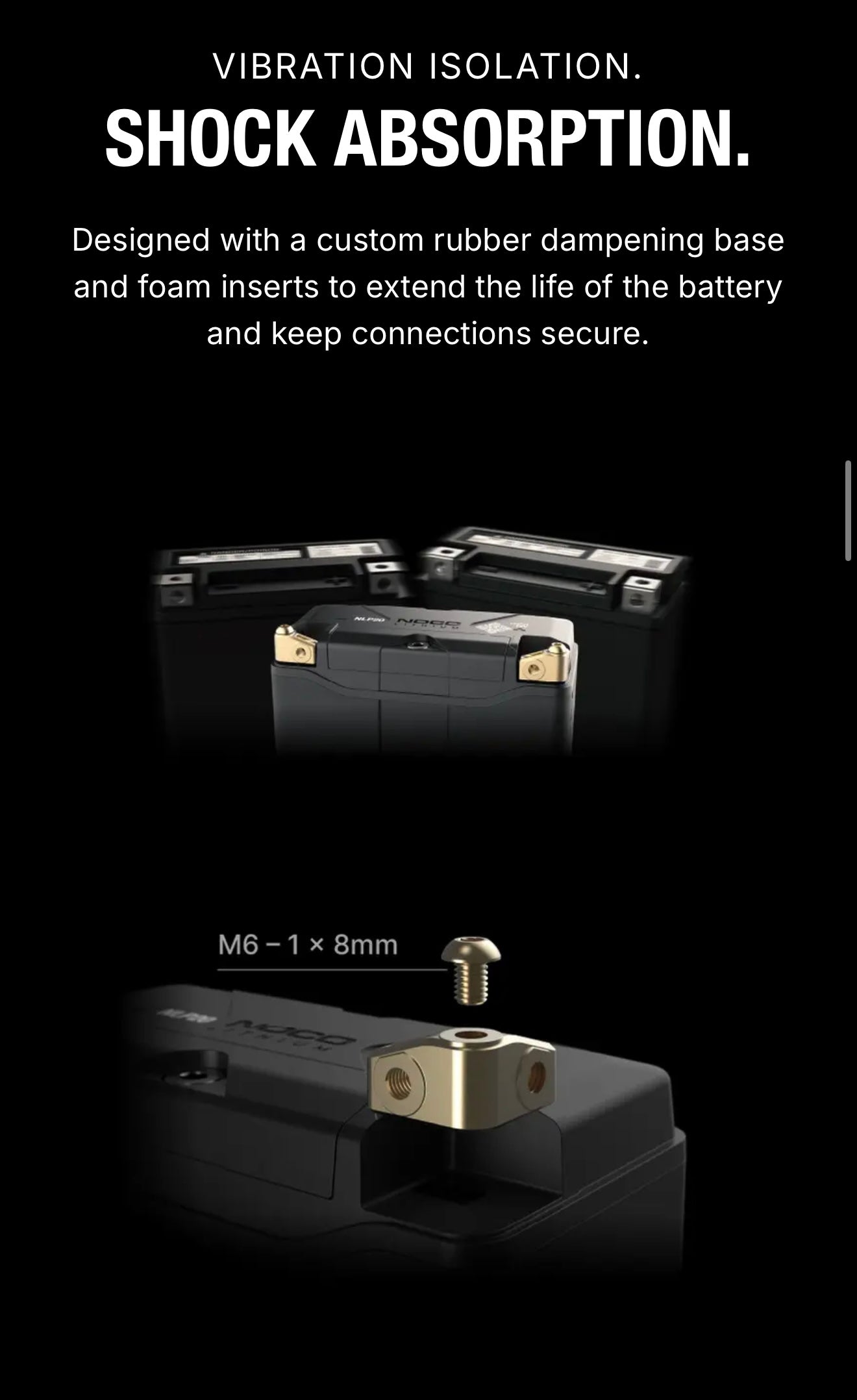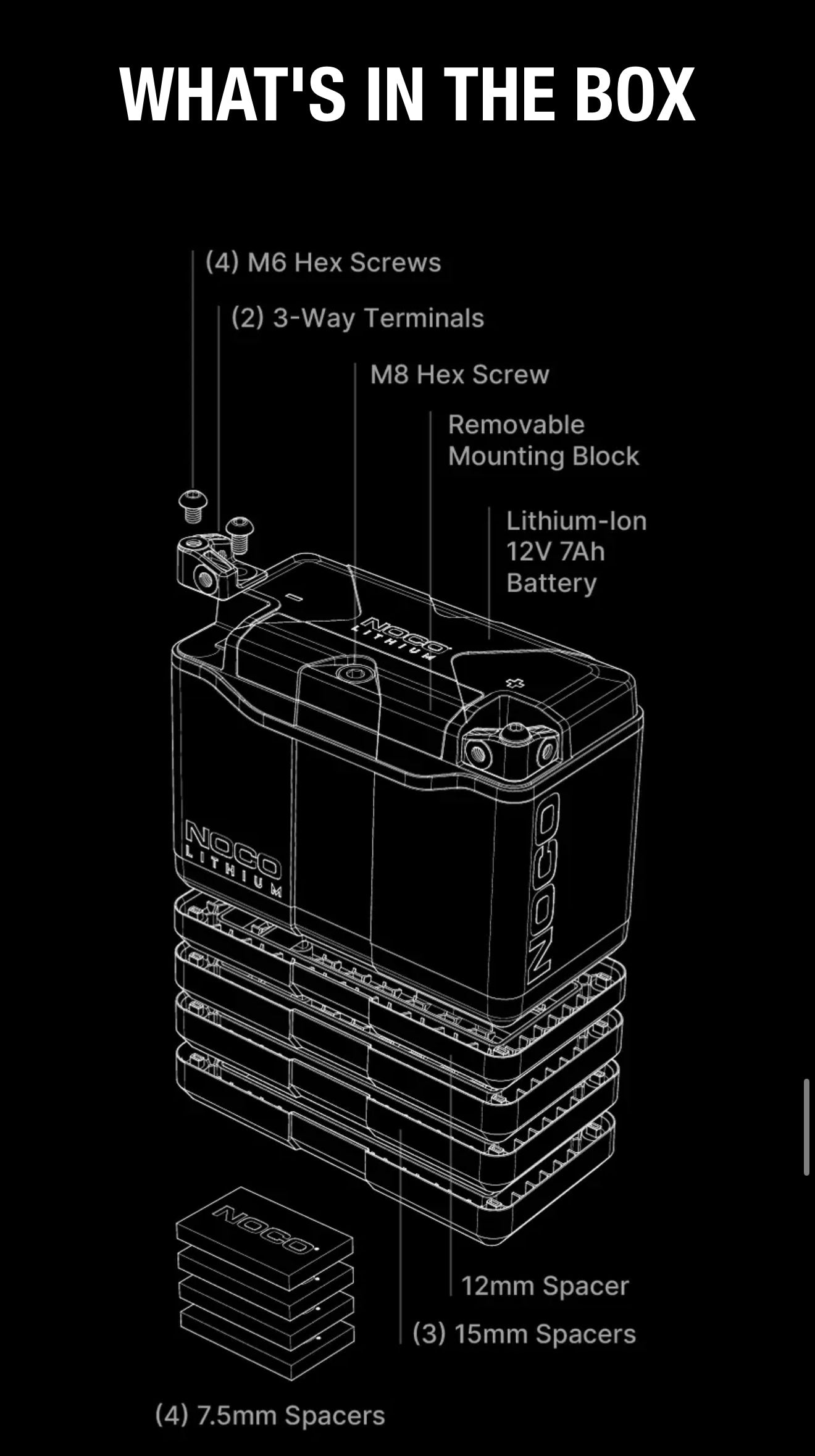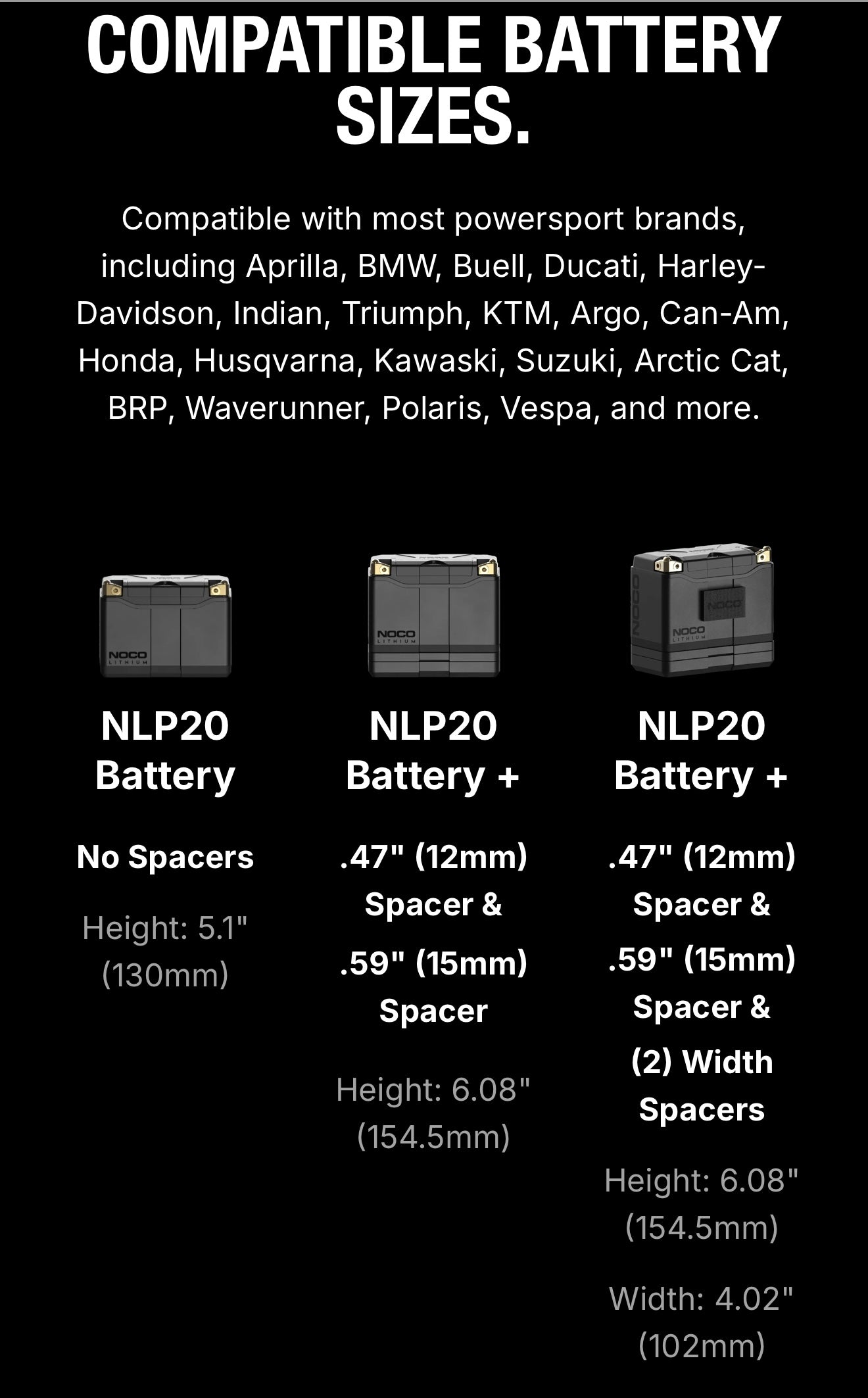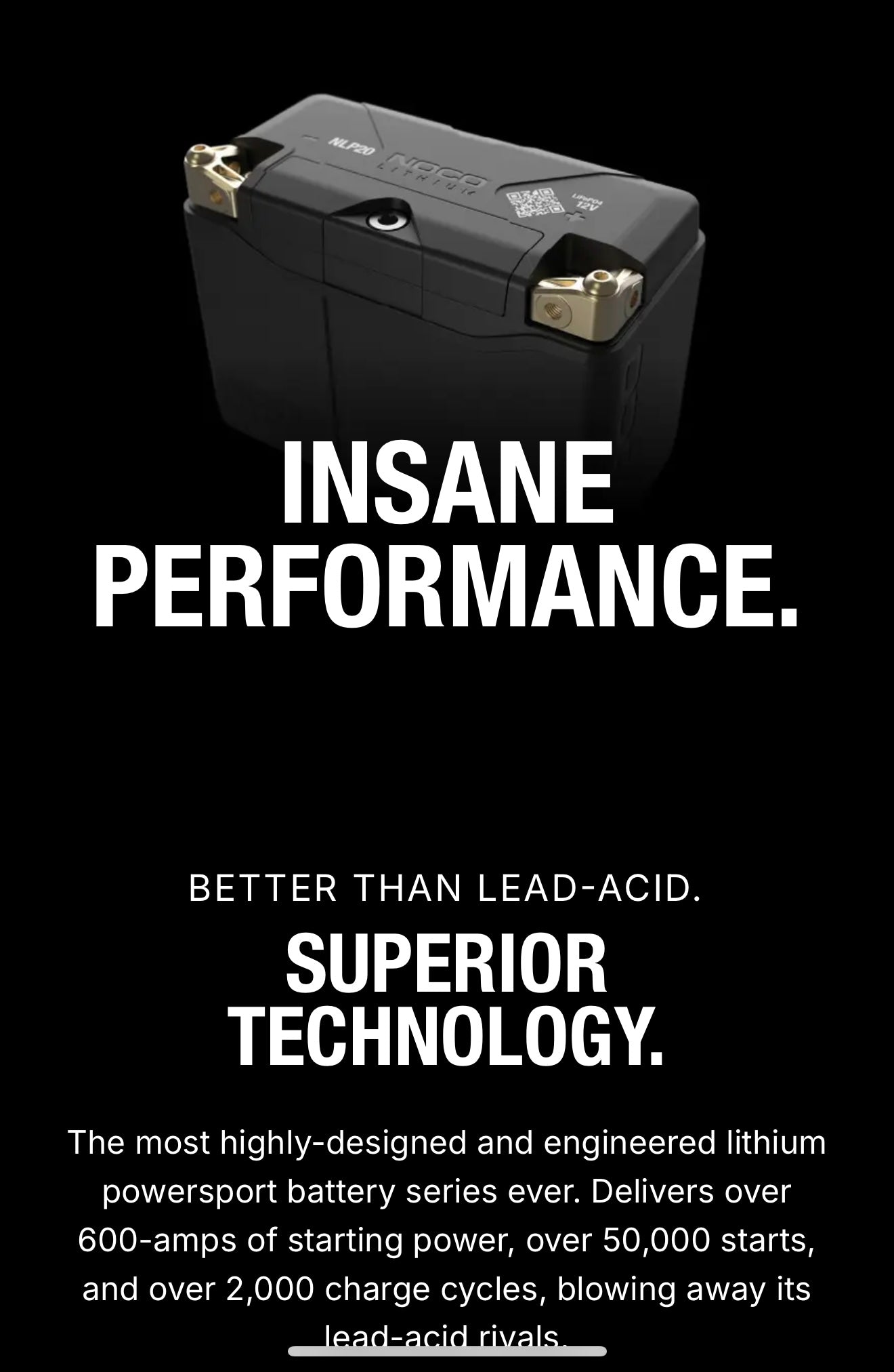 Introducing the all-new NOCO Lithium NLP20 12V Lithium Powersport Battery, a Group 20 battery, rated at 7Ah (89Wh) and 600-amps of starting power. It's better than lead-acid motorcycle batteries in almost every way: no sulfation, no activation, no acid, no maintenance, no water needed, and it comes fully charged and ready to install.