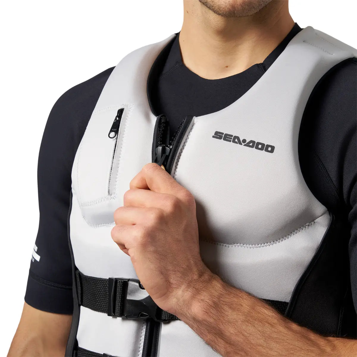 The Sea-Doo Wave Grip PFD is crafted from environmentally friendly ecoprene material that is rubber-free, flexible, lightweight, breathable and quick-drying, ensuring comfort during every ride. Built with side passenger handles and a chest pocket for convenience, this life jacket is designed for both the driver and passenger. UTAK material drains excess water for thermal-regulated comfort, while the large armholes and segmented design provide freedom of movement and a comfortable fit. Features include a YKK front zipper, loop at the back neck for attaching accessories, and a D-ring for securing a key lanyard